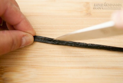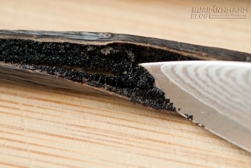 2.Tách quả vani ra theo chiều dọc bằng một con dao nhọn. Dùng dao cạo các hạt vani ra và cho hạt vào trong bát đường.