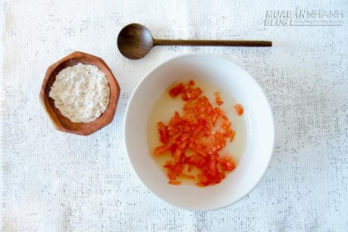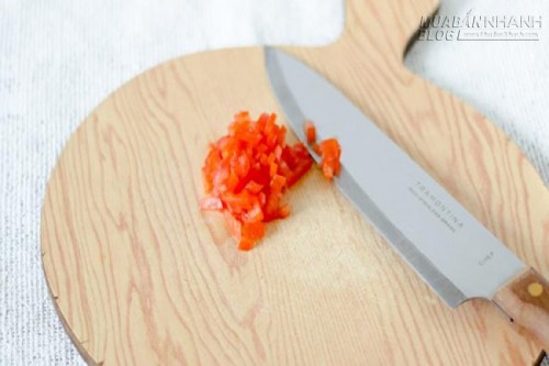 Bước 1: Rửa sạch cà chua cắt lát sau đó thái lại theo kiểu hình hạt lựu rồi bỏ vào bát.