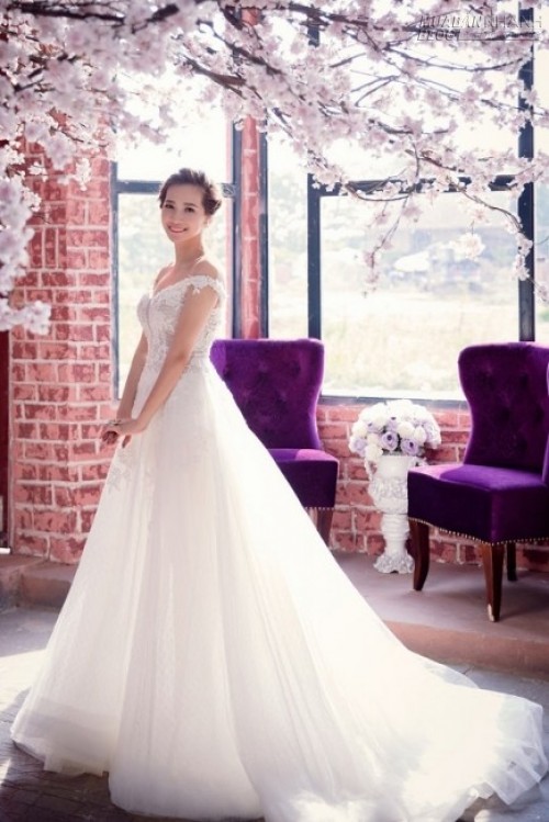 Chiếc váy vai xuồng khoe đôi vai trần gợi cảm giúp cô dâu tỏa sáng.