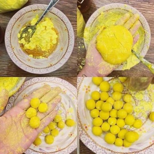 Bước 4: Hoàn thành xong, bạn tiến hành nhào nặn viên hoàn tinh bột nghệ bằng cách: Cho một lượng vừa đủ nguyên liệu ra lòng bàn tay, dùng tay vo tròn chừng 5 gam một.