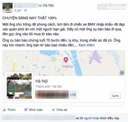 “Một ông chú trông rất phong cách, lịch lãm đi chiếc xe BMW nhập khẩu rất đẹp vào quán phở ăn với một người bạn gái, thấy có một ông cụ bán báo đi qua, liền gọị: 'Ông vào tôi mua tờ báo nào'.