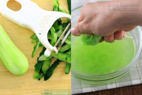 Dưa leo rửa sạch, xay nhuyễn và lọc lấy nước cốt đổ vào ly, nhúng túi trà vừa chuẩn bị vào ly nước dưa leo, để cho trà ngấm.