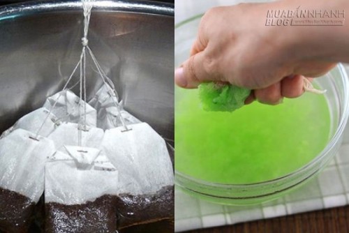 Đầu tiên, bạn lấy 1 ly nước sôi, cho 2 túi trà vào như khi pha nước trà bình thường. Sau 15 phút, trà nở và ra nước, bạn có thể vớt túi trà ra, phần nước trà dùng để uống bình thường. Vắt nhẹ cho túi trà ráo.
