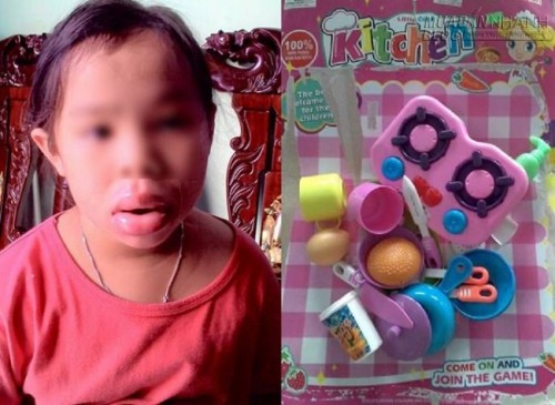Một bé gái bị sưng miệng sau khi ngậm món đồ chơi nấu ăn bằng nhựa xuất xứ Trung Quốc.