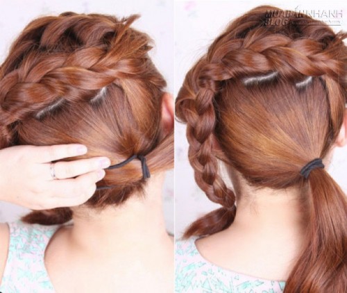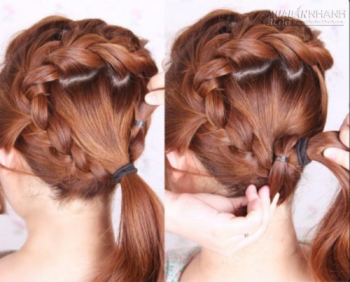 Dùng một chút tóc trên đỉnh đầu chếch về phía bên phải rồi tết ba. |