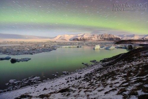 | Ánh cực quang huyền ảo và đỉnh núi tuyết phủ trắng xóa tại cực bắc |