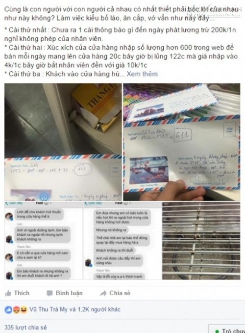 Câu chuyện xảy ra với một bạn trẻ có facebook tên Nguyễn T Linh. Không chịu được cách hành xử của chủ cửa hàng nơi mình làm việc, Linh bức xúc lên tiếng: “Cùng là con người với con người với nhay cả, có nhất thiết phải bốc lột của nhau như này không? Làm việc kiểu bố láo, ăn cắp, vớ vẩn như này đây”.![]()