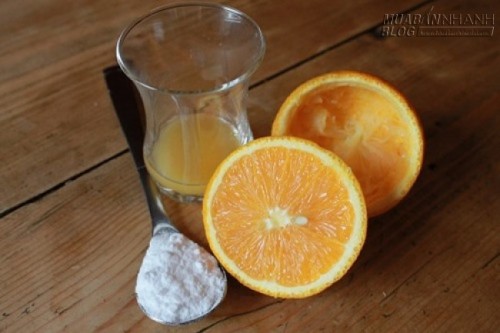 Sau khi xông hơi xong, bạn tiến hành thoa mặt nạ trị mụn lên da. Công thức bao gồm: 1 thìa bakingsoda, nước cam nguyên chất. Bạn trộn baking soda với một lượng nước cam vừa đủ để tạo thành hỗn hợp sền sệt. Bạn thoa đều lên hỗn hợp lên vùng da bị mụn. Sau 5 phút, bạn thoa thêm một lớp nữa rồi chờ mặt nạ khô. Bạn rửa lại mặt với nước sạch sau 15 phút.