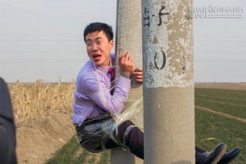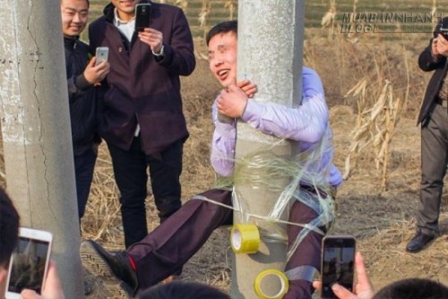Mới đây, trên con đường băng qua ruộng ở thôn Hàn Ninh, thị trấn Duy Phường, tỉnh Sơn Đông, Trung Quốc, người ta bắt gặp một anh chàng bị trói chặt lên cây cột điện gần đó.