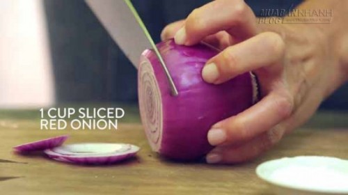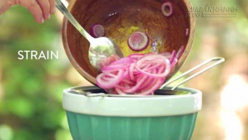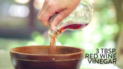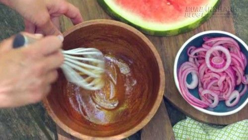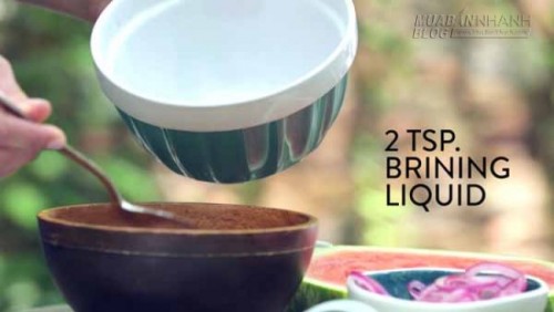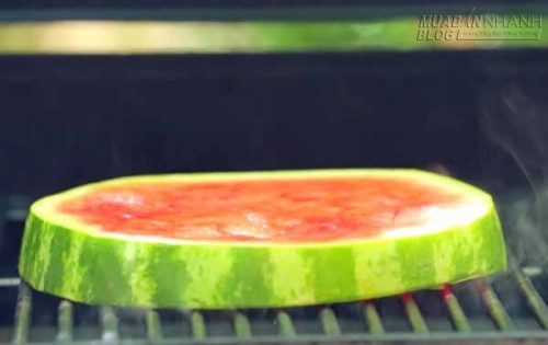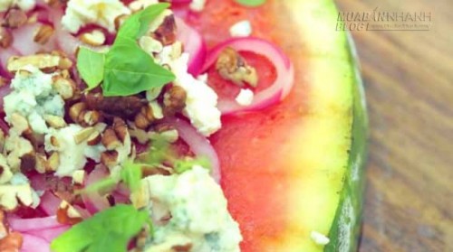 Xắt hành Chuẩn bị 1 lát dưa hấu Trộn theo tỉ lệ 3 thìa giấm đỏ, 1 thìa đường, 1/4 thìa muối Để ngấm, và lọc lấy nước Thêm nước muối, thêm dầu ôliu Trộn đều hỗn hợp Phết lên lát dưa hấu Đưa vào nướng Rắc hành, pho mát Một chút trang trí