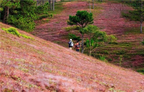 Cỏ hồng mọc bên sườn đồi, thung lũng tạo ra tấm áo hồng phản chiếu sáng dưới ánh mặt trời.