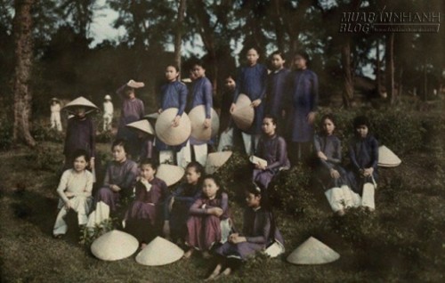 Hình ảnh về những nữ sinh mặc áo nâu, khăn vấn đầu thời kỳ Pháp thuộc.