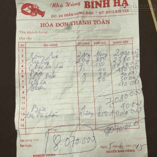 Một bạn có nickname Hoang Yen Lee kể lại trên trang cá nhân, một nhóm bạn Trung Quốc của cô vào một nhà hàng có tiếng ở ngay trung tâm thành phố Hải Phòng. Khi ăn xong, hóa đơn lên tới hơn 8 triệu đồng cho 5 người ăn. Theo hóa đơn, một kg tôm sú giá 1.400.000 đồng, tu hài là 850.000 đồng.