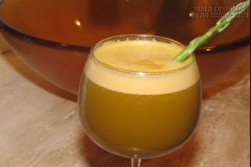 Ngâm măng tây trong nước lạnh chừng 5 phút, rồi gọt vỏ dưa chuột, táo, chanh và cắt thành từng miếng cỡ vừa. Cho tất cả cả các nguyên liệu bao gồm gừng, dưa chuột, chanh, cần tây và măng tây vào một ép trái cây để ép lấy phần nước.