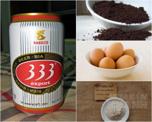 - Bạn đổ khoảng 1 thìa canh bia vào bát, sau đó cho bã cà phê và bột đậu đỏ vào cùng.