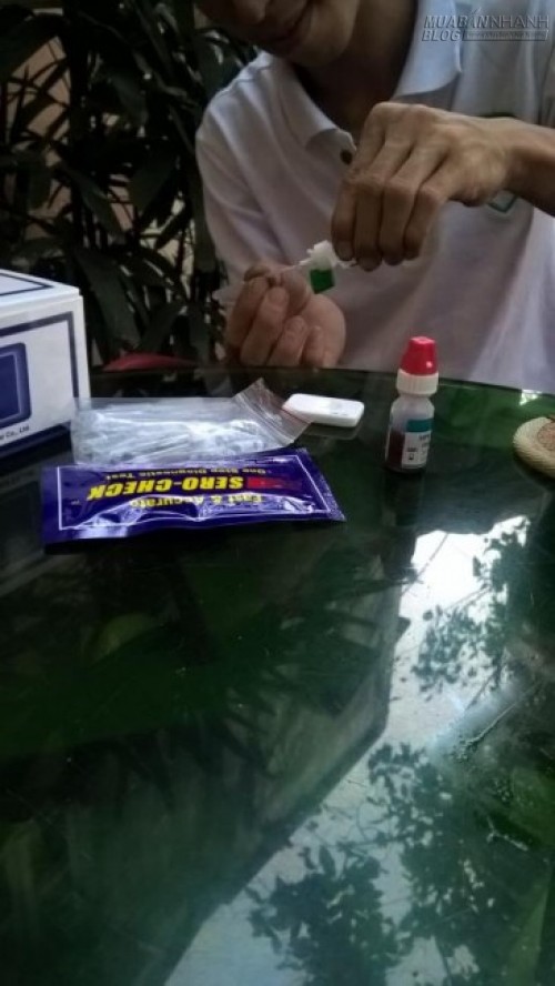 Chúng tôi thắc mắc: “Làm sao để lấy được máu?”, T. bày cách: “Chị ra cửa hàng thiết bị y tế mua dụng cụ lấy máu bằng kim tự động, chỉ cần bấm vào gót chân, đầu ngón tay, không hề đau. Nếu không thì chị nhờ nhân viên y tế nào đó gần nhà lấy máu giúp, chỉ vài giọt thôi”. T. mồi chài thêm: “Nếu lấy cả hộp (25 que) dùng để thử lâu dài, sẽ giảm giá còn 200.000đ/que, tặng kèm dụng cụ lấy máu luôn”.