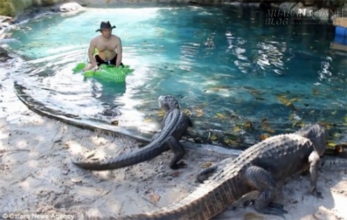 Anh Charles Wieand, 34 tuổi, dùng một chiếc phao bơi trẻ em để thư giãn trong hồ cá sấu ở trại cá sấu Everglades tại Homestead, Floria mà không hề hấn gì. (Ảnh: Whatsthefuzzabout WordPress)
