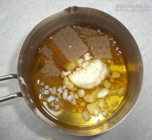 Bước 1: Cho phần dầu ô liu vào nồi nấu trên bếp lửa nhỏ rồi cho phần sáp ong vào đun sôi chừng 10 phút. Lúc này cả dầu ô liu và sáp ong sẽ tan ra đều.