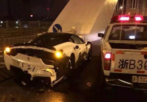 Chiếc Ferrari 458 màu trắng vi phạm luật giao thông, bị truy đuổi bởi chiếc bán tải Nissan bật còi hụ của cảnh sát giao thông ở Ninh Ba (Chiết Giang, Trung Quốc). Cuộc đua tốc độ bất ngờ kết thúc khi siêu ngựa dừng đột ngột trên cầu khiến xe cảnh sát đâm thẳng vào đuôi.