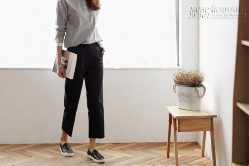 Với quần âu, dáng quần ống đứng, hơi ôm, thêm chi tiết ly chạy dọc hoặc kẻ sọc dọc là tốt nhất. Phần thân dưới khá to nên bạn cũng nên chú ý chọn gam màu trầm tối để tạo cảm giác thon gọn nhé.