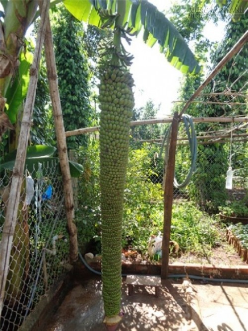 Buồng chuối nhà anh Trần Thanh Hải (ở thôn 4, xã Ea Kao, Buôn Ma Thuột) dài hơn 2 m với gần 150 nải. Một nải chuối có khoảng 16 đến 17 quả. Vợ anh Hảicho biết chuối thuộc giống chuối cau có trái nhỏ dài chừng 10 cm. Khi trồng 1 năm thì cây trổ bông kết trái. (Ảnh: Tiền Phong)