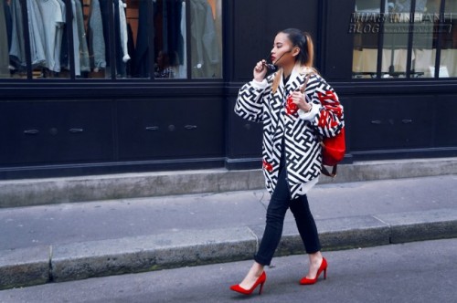 Cô bạn này rất biết cách làm cho mình nổi bật khi diện các phụ kiện cùng tone đỏ tươi với chi tiết trên áo. Chiếc bomber jacket với họa tiết "mê cung" cũng là 1 item cực lạ giúp cô nàng thu hút ánh nhìn.