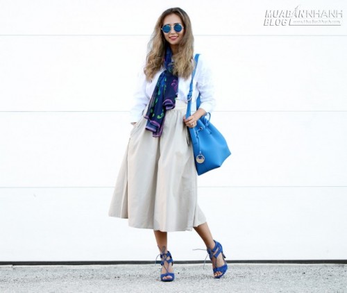 Thanh lịch và cổ điển với váy midi vải thô kết hợp cùng sơ mi trắng. Chủ nhân bộ đồ thể hiện sự tinh tế trong cách ăn mặc khi chọn những phụ kiện đắt giá như sandal buộc dây, kính mắt gương và túi bucket tone xanh để "làm điệu" cho set đồ.