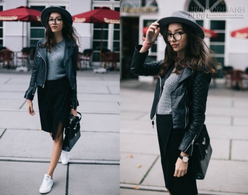 Một sự pha trộn giữa nữ tính và cá tính khi kết hợp item bụi bặm như jacket da với chân váy xẻ tà. Set đồ đã được cô bạn trung hòa một cách khéo léo khi diện giày sneaker khỏe khoắn và mũ fedora.