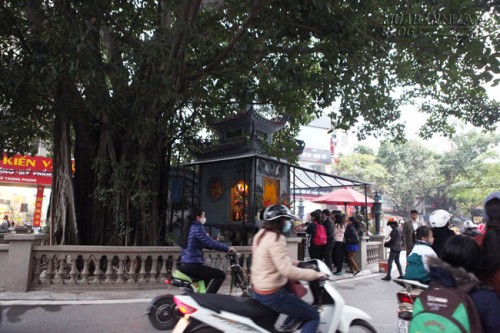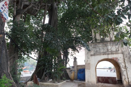 Dưới gốc cây có xây hàng rào bảo vệ và có một ngôi miếu được dựng lên.