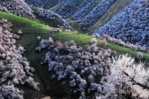 Những cây mai hồng, mai trắng bung nở từ tháng 6 đến tháng 9 trên những đồng cỏ bạt ngàn ở Tân Cương (Trung Quốc).