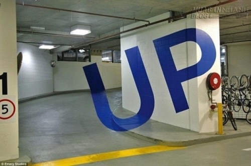 Bãi đậu xe ở tòa nhà Eureka, Melbourne, Úc nổi bật với chữ Up được vẽ theo hiệu ứng 3D.