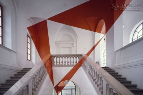 Nghệ sĩ Felice Varini đã sử dụng sơn để tô vẽ căn phòng, tạo ra ảo ảnh quang học độc đáo.