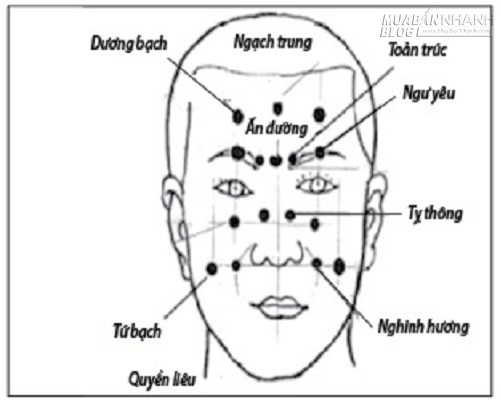Dương bạch: trước trán, trên đường thẳng qua chính giữa mắt và phía trên lông mày cách 1 thốn.