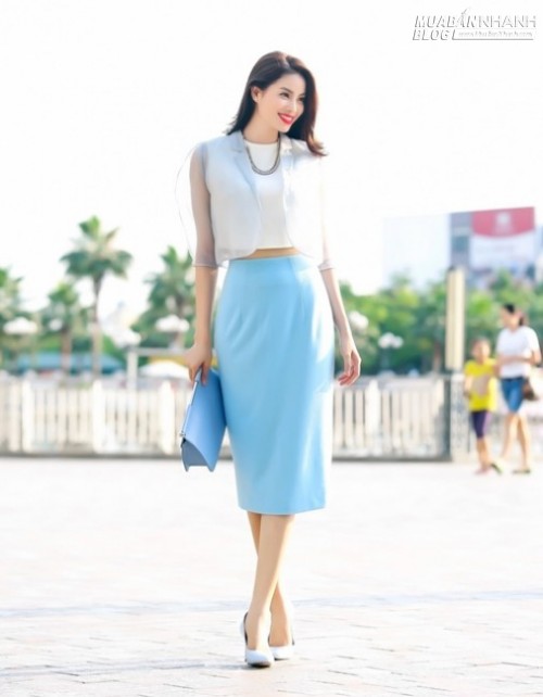 Xanh thanh bình và hồng thạch anh là hai sắc màu chủ đạo được ưa chuộng trong năm 2016. Khác với hồng thạch anh, màu xanh thanh bình có những tông đậm và nhạt vì vậy tùy theo sở thích các nàng sẽ có nhiều lựa chọn hơn trong trang phục của mình. Diễm My trẻ trung trong chân váy màu xanh thanh bình tông nhạt.