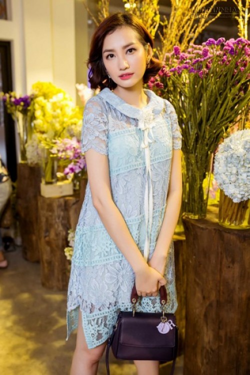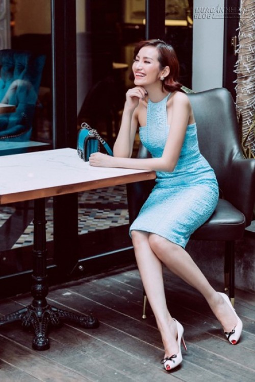 Sắc xanh da trời nhạt lại được diễn viên Diễm My 9x lựa chọn cho bộ váy sát nách phom dáng cổ điển của mình.