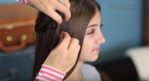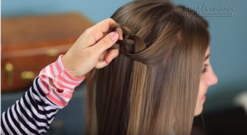 Lấy lọn tóc thứ hai kẹp vào giữa 2 ngón tay, luồn qua vòng đầu tiên và xoáy như trên