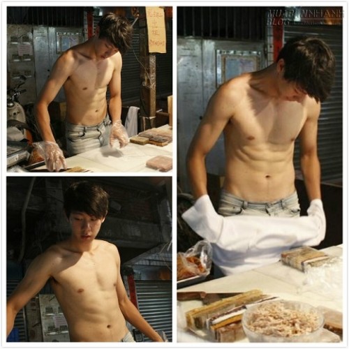 Anh chàng luôn biết cách khoe khéo body sáu múi hấp dẫn mỗi khi đứng làm bánh ở 1 góc chợ như thế này