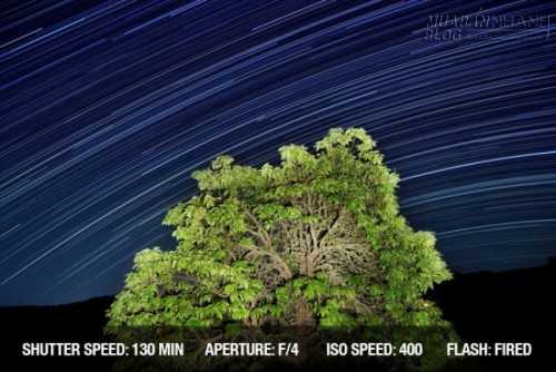 Khi chụp bầu trời đêm với thời gian phơi snags đủ lâu, thường là 15 phút trở lên, bạn sẽ thấy được rõ sự chuyển động của Trái đất. Những thiết bị cần chuẩn bị là một chân máy thật vững chãi, dây bấm mềm, hoặc remote. Lấy nét ở vô cực, và thiết lập chế độ B (Bulb), khẩu độ để ở f/4 để có hiệu ứng quang học đẹp nhất, sau đó giữ nút chụp ở dây mềm. Bạn nên đặt ISO ở mức 100 để hạn chế sạn xuất hiện, vì thời gian phơi rất lâu, lên tới hơn 15s. Để kết thúc thao tác chụp, sau một khoảng thời gian phơi sáng mà bạn cảm thấy là đủ lâu, ấn nút trên dây bấm mềm hoặc remote một lần nữa để đóng màn trập.