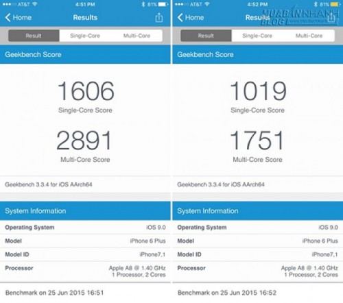 Điểm hiệu năng iPhone 6 Plus khi bật Low Power mode (bên phải) và không bật (bên trái). |