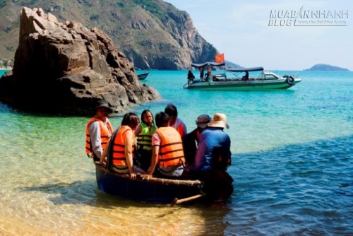 Để ra được thuyền, du khách phải lên những chiếc thúng hoặc phà tự chế để ngư dân dầm mình trong nước kéo ra thuyền nằm cách 100 m. Ảnh: Nhi Nguyễn.