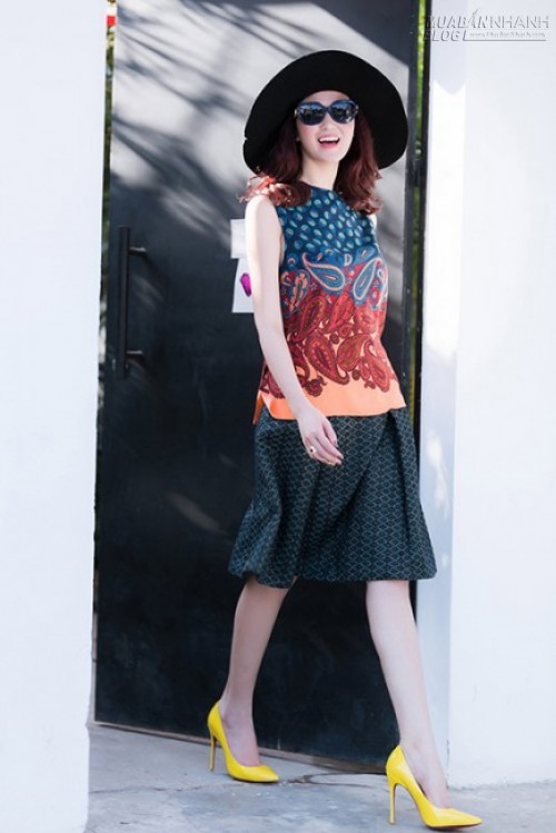 Màu sắc trang phục và phụ kiện ăn ý cùng chung cảm hứng thời trang xuân hè rộn ràng. Những màu sắc tươi sáng như hồng phấn, cam, vàng chanh và cả sequins lấp lánh được trộn rộn duyên dáng. Hoạ tiết paisley nữ tính không ngừng được yêu thích trên một chiếc áo không tay của Khánh My truyền cảm hứng thời trang cho phái đẹp mùa này.