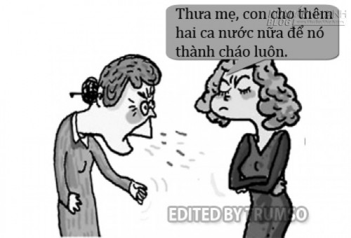 - Thưa mẹ, con cho thêm hai ca nước nữa để nó thành cháo luôn.
