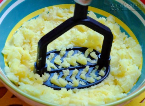 Bước 1: Khoai tây gọt vỏ, bỏ mắt, rửa sạch, cắt miếng. Sau đó đem luộc chín mềm. Thử khoai chín bằng cách dùng đũa xiên vào khoai, nếu thấy xiên dễ dàng là khoai đã chín. Khoai chín chắt hết nước ra khỏi nồi đặt tiếp lên bếp nhỏ lửa để cho khoai khô không bị nhão.