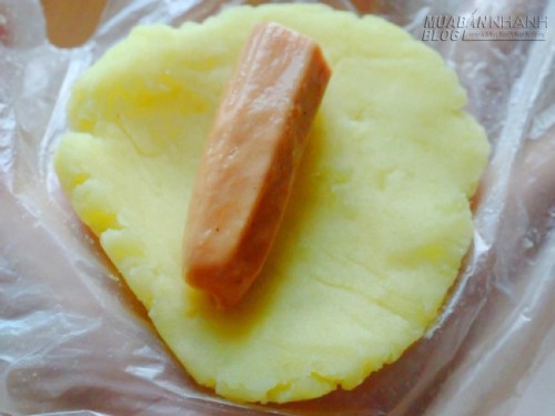 Bước 3: Dùng găng tay sạch, viên từng viên khoai tây nghiền, rồi ấn dẹt, đặt xúc xích hun khói vào giữa, bọc lại và dùng tay bóp và vê lại thành một khối.