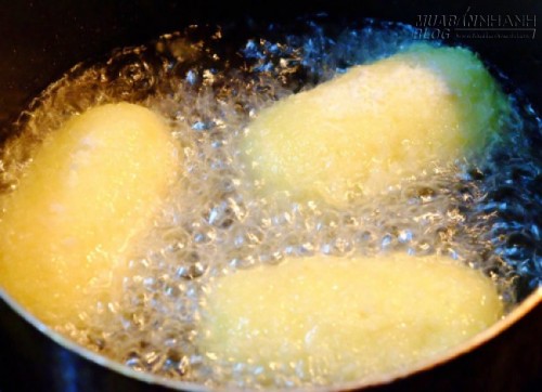 Bước 6: Cho nồi chống dính sâu lòng lên bếp, cho lượng dầu đủ sâm sấp mặt khoai là được. Dầu sôi bạn thả từng viên khoai vào nồi, lăn nhẹ tay để khoai được chín vàng đều các mặt. Không chiên trong lửa nhỏ vì sẽ làm khoai ngấm dầu vào trong dễ bở bục.