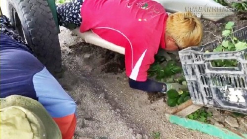 Một bạn trẻ người Hàn Quốc đang nằm trên tấm nhựa gắn liền với xe kéo để nhổ cỏ ở một trang trại trồng dâu tại Stanthorpe, Australia