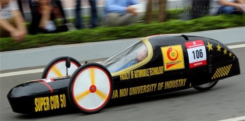 Cụ thể, sau 8 vòng chạy với quãng đường 9,265 km với tốc độ trung bình 26 km/h, chiếc xe tự chế của nhóm sinh viên khoa Công nghệ ôtô – trường Đại học Công nghiệp Hà Nội chỉ tiêu thụ 3,26 cc xăng. Nói cách khác, nếu đổ một lít xăng vào chiếc xe này, bạn có thể đi được quãng đường khoảng 2948 km. Một con số quá sức ấn tượng phải không nào?