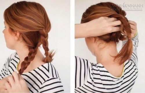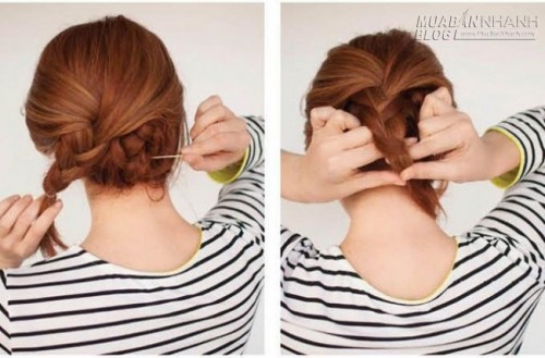 | Cuộn tròn phần tóc phía dưới và dùng kẹp tăm gắn chặt vào chân tóc. Tiếp tục giấu đuôi tóc ở bím còn lại bằng kẹp tăm. |