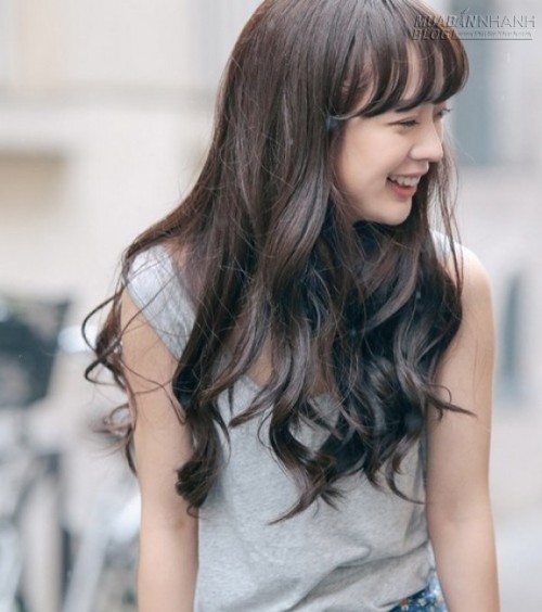 Tóc uốn xoăn nhẹ không quá rối là sự lựa chọn hoàn hảo cho những bạn gái có khuôn mặt dài. Bạn chỉ cần làm xoăn nhẹ hoặc xoăn gợn sóng bồng bềnh, thả tóc xuống hai bên má, cắt mái bằng sẽ giúp khuôn mặt bạn trở nên nữ tính và nhẹ nhàng hơn.