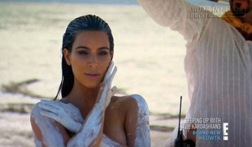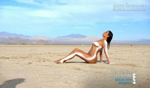 Kim Kardashian vừa tiết lộ hậu trường quay phim truyền hình thực tế "Keeping Up With The Kardashians" tại Los Angeles trong tập mới nhất phát sóng trên kênh "E!News". Ngôi sao 34 tuổi trút bỏ xiêm y, khoe đường cong bỏng mắt dưới cái nắng chói chang giữa sa mạc. Kim được quét một lớp sơn trắng dọc cánh tay, eo , chân và hai bầu ngực. Bà mẹ một con phơi thân dưới nắng để có được những shot hình nóng bỏng nhất.